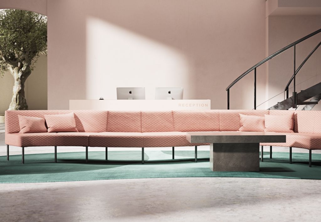 Företagsloungen kan inredas med Mingle Lounge i färger som sticker ut och tar för sig.